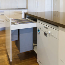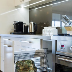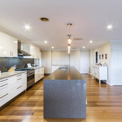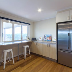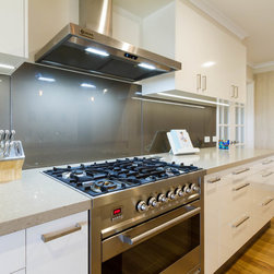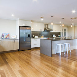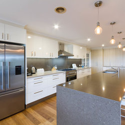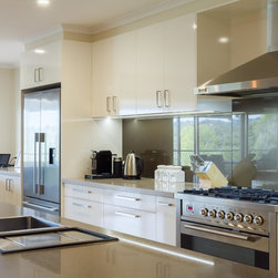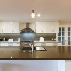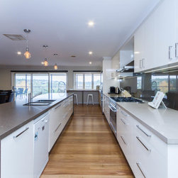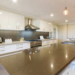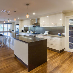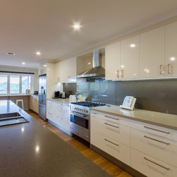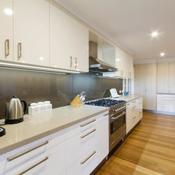 This lovely, modern kitchen is part of an extension on a home and includes a walk-in pantry. It is quite large, includes everything one could want in a kitchen, and is ideal for entertaining for a large group of friends. Gloss off-white doors with square handles reflect the modern style, but the look is softened with warm timber colours in accompanying laminate feature doors and timber floors. Caesarstone makes an appearance in two differing benchtop colours, each complimenting the other. The large area is replete with cupboards housing clever storage solutions. Finally, a simple glass splashback reflects the benchtop colours and completes the look of modern simplicity in the large, open space.
