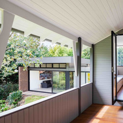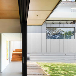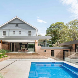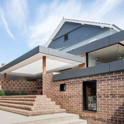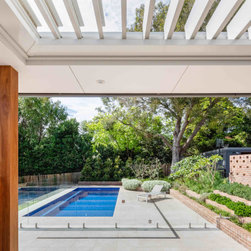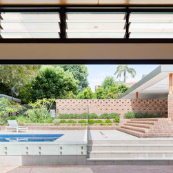 The solution was to add a modern steel and glass pavilion, linked to the outdoor pool at garden level and the new kitchen and outdoor entertaining area at the rear of the house. The two areas are unified by the use of detailed brickwork and the flat roofs are subservient to the original house. A new brick screen wall hides the open car-port and creates an outdoor room facing the pool and garden. The operable roof over the BBQ and dining area means it can be used all year round and in all weather. A wide set of brick stairs links the pool and garden to the main house.