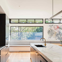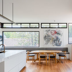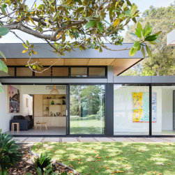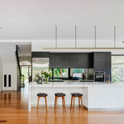 The new extension is modern and stream-lined and is not visible from the street. The landscape design unifies the additions and pool with the existing garden as well as providing the original home with a more formal setting at the front. The new kitchen and dining area has a separate walk-in pantry, laundry and powder room. It opens onto the original wrap-around verandah and the windows frame the magnificent magnolia tree to the east. The new kitchen opens onto the covered outdoor deck and pool beyond and a 4 metre island bench means there is ample space for the family of five to congregate and function with ease. This project is all about making the most of the attributes of the existing home and garden, uniting the new with the old with a seamless and contemporary design.
