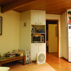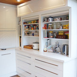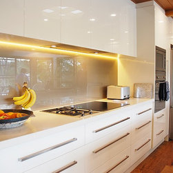The attached pictures show the finished product. Note the grooved drainer section in the stone for the sink and the electronic rolladoor over the appliance pantry which hide the air conditioner. This is a clever way to give the kitchen a clean look when the air conditioner is not being used.