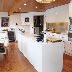 Other things to consider were added storage, more clear bench area & better benchtop lighting. The vacuum cleaner & brooms needed to be housed & a wall air conditioner had to be reinstalled & hidden in the joinery. Ease of use at benchtop level for appliances & easy access to cooking needs near the cooktop was desired. The client also needed a wine fridge to be a part of the kitchen inclusions.