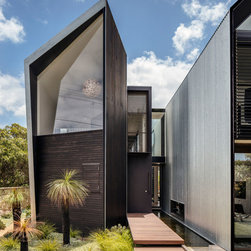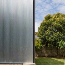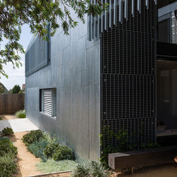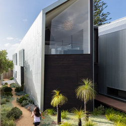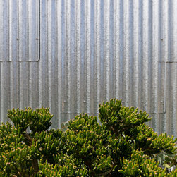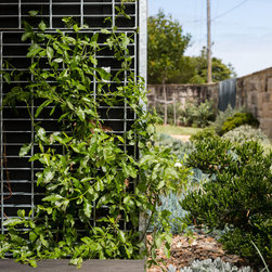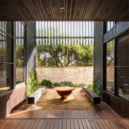 Vines were planted in the fire pit area and on the rear facade of the house to eventually scale the walls, visually soften the build, and add a wonderful textural element.
