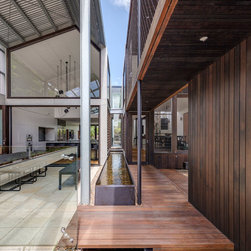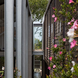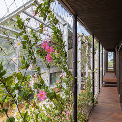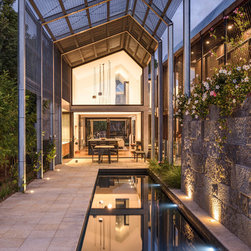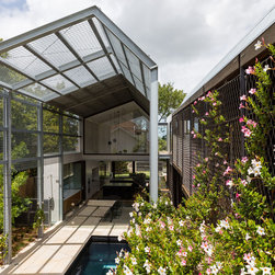 Above the pool mandevilla is mass planted to grow over wire mesh which, over time, will create a vertical 'blanket' to soften and compliment the strong architectural lines of the home.