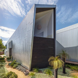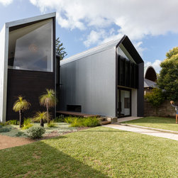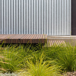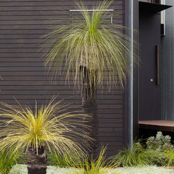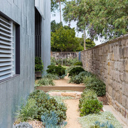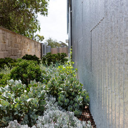 The landscape design was divided into several components, the side passage consists of a crushed granite pathway and robust succulent gardens leading to a semi enclosed fire-pit area. The tones, textures and layout of the various succulents aim to compliment the surrounding materials of the stone wall and steel facade of the build.