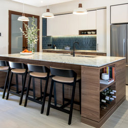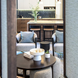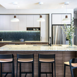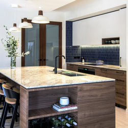 Our client’s time spent in Japan was our inspiration for the adjacent kitchen which incorporates rich timber tones and beautiful Japanese handmade splashback tiles.