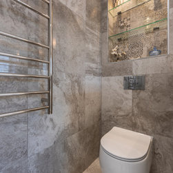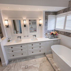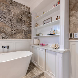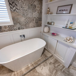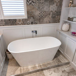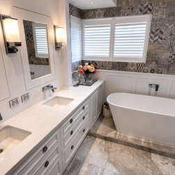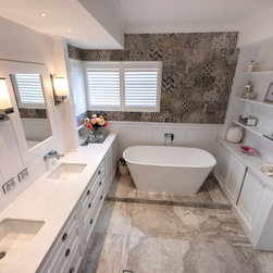 White and soft brown tones were used in this Hampton style bathroom, with soft pattern tiles on both floor and feature wall, custom corian pillars were made along with a custom made vanity complimented by beautiful wall hung lights. This bathroom has the look of pure luxury making this a very and tranquil relaxing space.