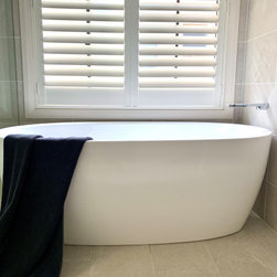 The Sheraton 1600mm freestanding bath is positioned under the plantation shutter window which provides the perfect place to relax and unwind.
