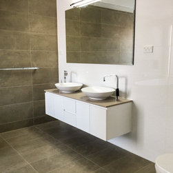 Gorgeous free standing bath, wall mount vanity with above counter bowls and chrome tower mixers, above mirror lighting and feature wall created by using the same colour tile as the floor tile.