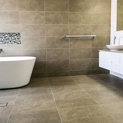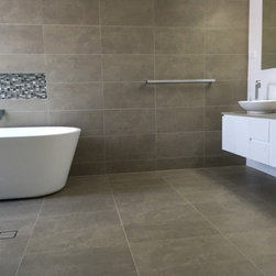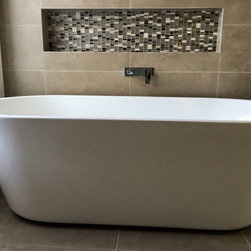 Gorgeous free standing bath, wall mount vanity with above counter bowls and chrome tower mixers, above mirror lighting and feature wall created by using the same colour tile as the floor tile. The mosaic tiled niche above bath is perfect for that glass of wine or a candle when enjoying a tub