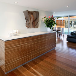 With enough seating for six or more, the island is the focus of the design and the area. Stretching from one end of the kitchen to the other, it is a multifunctional space that makes the kitchen the perfect gathering place for a large family or when entertaining a crowd. The island also defines the entry and exit points from the kitchen, assisting its ability to merge within the open-plan area in which it sits.