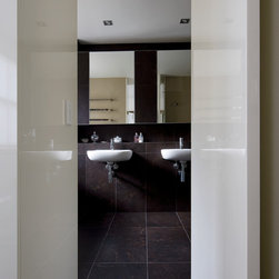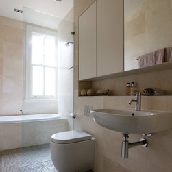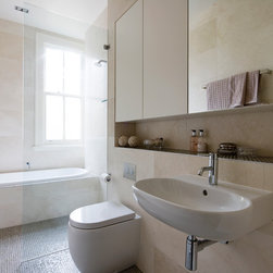 This bathroom uses the natural soft light to play against the neutral palette which gives an elegant, and soothing feel to the room. The clever balance of cabinetry, mirrors, display shelf combined with the sink and toilet creates a feeling of space and long lines and a feeling that this bathroom...