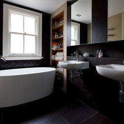 Whilst this bathroom has a serious side, it is also playful. It plays the dark strength of the floor and and the main area wall tiles against the lighter timber and tiles in the shower.