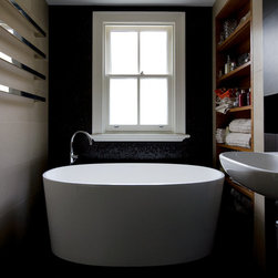 This bathroom uses the dark base palette to play off the lighter walls and timber with great success. When the natural light filters through the window it highlights the perfect balance of drama and playfulness.