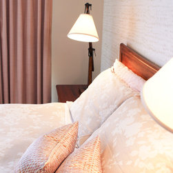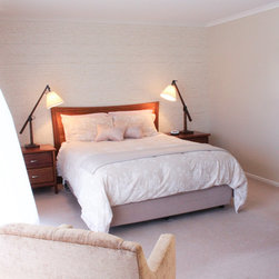 To refresh a tired bedroom, soft taupes and pinks were blended together to create a calming bedroom retreat. A subtle patterned feature wall provides texture and interest and complements the client's watercolour art collection.