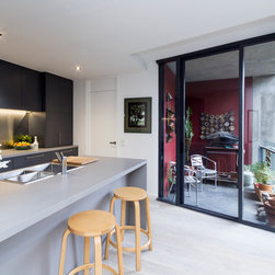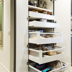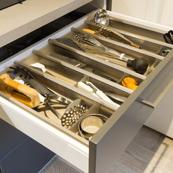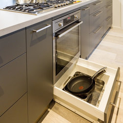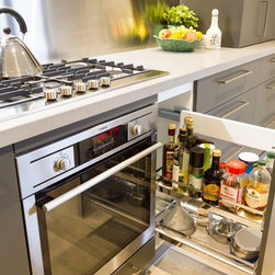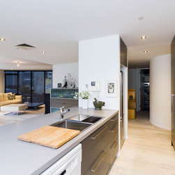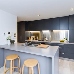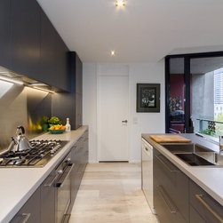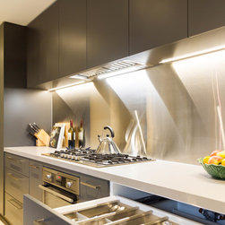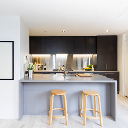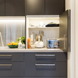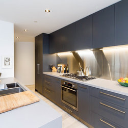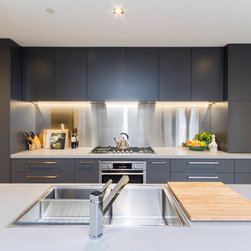 This modern kitchen has been designed with simplicity and maximum storage in mind. The grey tones are striking against the wall color creating an interesting contrast. The lines are simple and straight making overall effect cool and sleek. The designer made maximum use of the space for storage all the while fulfilling the client’s wishes regarding functionality. The fridge and pantry are hidden creating the illusion the kitchen is smaller than it is. This layout also keeps what’s inside the fridge and pantry a well-kept secret, all the while remaining easily accessible. Throw in the beauty of the reflective stainless steel splash back and the end result is a great example of sleek form and function, modern style, and simple beauty.