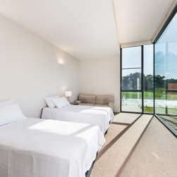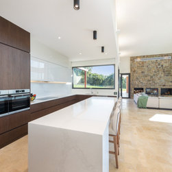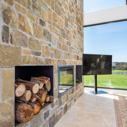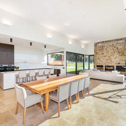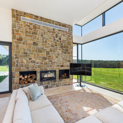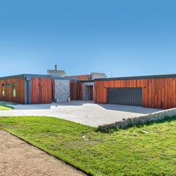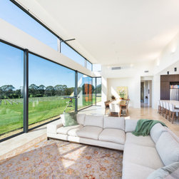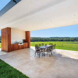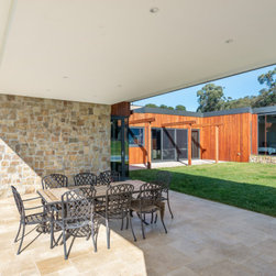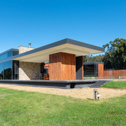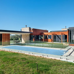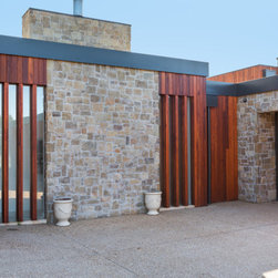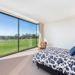 The main house and out building were designed for a family home to support the new winery set up for the property. the house has a separate area for guests and extended family, with privacy to the main house areas. The timber cladding can be maintained due to the single level house and the stone work depicts the entry as well as bookends the living rooms encasing the fireplaces. The large windows capture and frame the views when using the spaces.