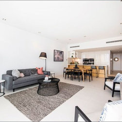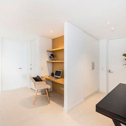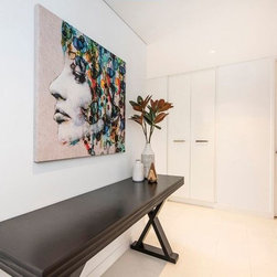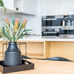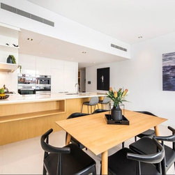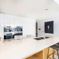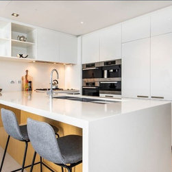 This sleek open plan design flows seamlessly, with an abundance of natural light amplified by extra high ceilings throughout living, dining and kitchen areas. Flawless cabinetry with stone benchtops highlight a gourmet kitchen fully appointed with Miele appliances, including 4 ovens, 2 cooktops and fully integrated double fridge/freezer, dishwasher, wine fridge, and coffee machine.