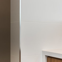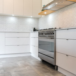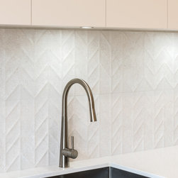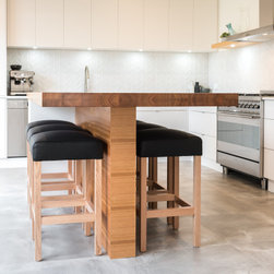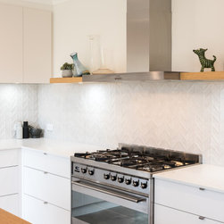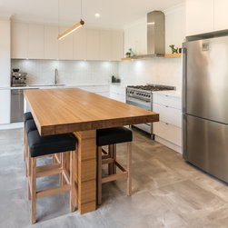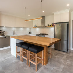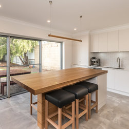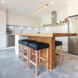 Textured whites team up with concrete and chunky timber, providing a warm, industrial style.