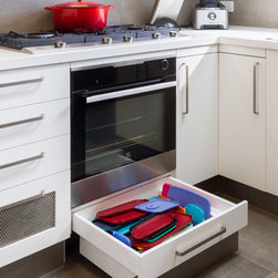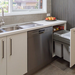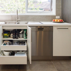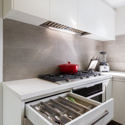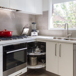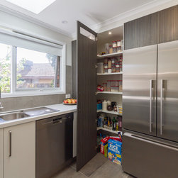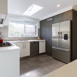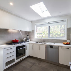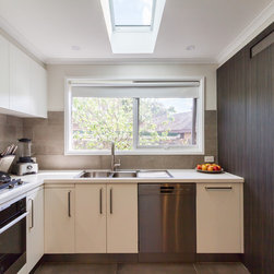 A small, unworkable space has been flipped and beautifully renovated into a practical, usable space. Designer Pete suggested switching the cooktop and pantry areas to make better use of the space and adding the skylight allows the natural light to flood in. Not bad for a small kitchen!