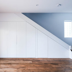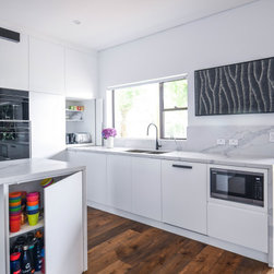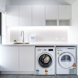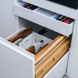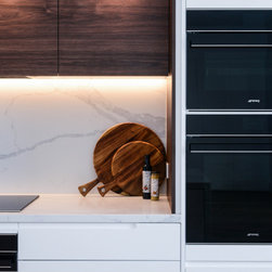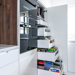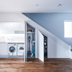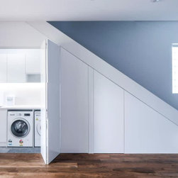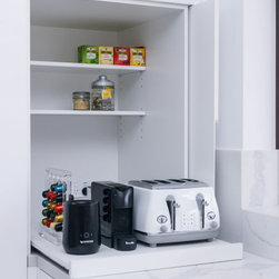 Minimalistic Kitchen | Pull-Out Appliance Nook | Under Stair Laundry | Mesh Bar