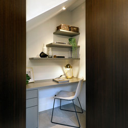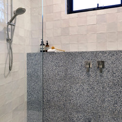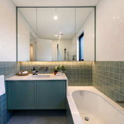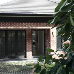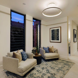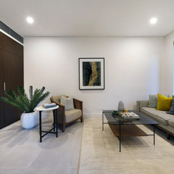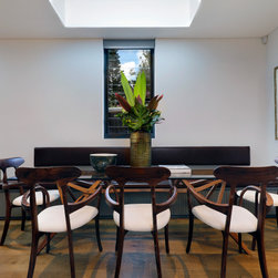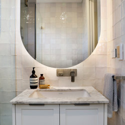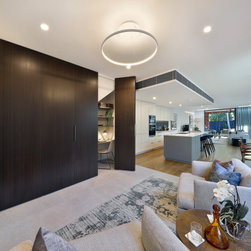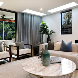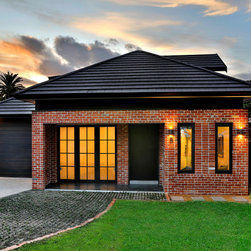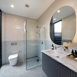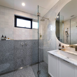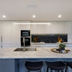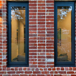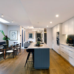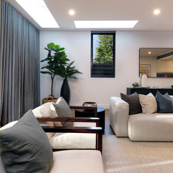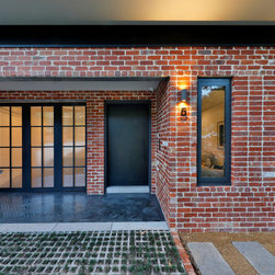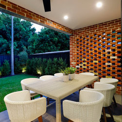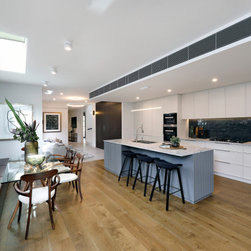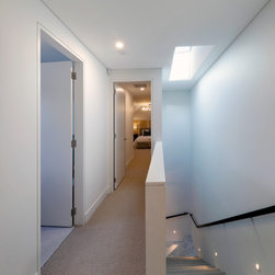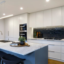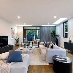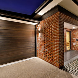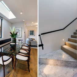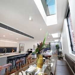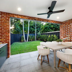 Contemporary inner west 2 story duplex including recycled bricks, custom garage doors, both tiled and matt colorbond roofing and commercial framed windows. The interior includes specialty materials and features including venetian plaster feature walls, Spanish tiles to the bathrooms, terrazzo features, and a modern designer kitchen with super white marble benches.
