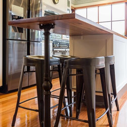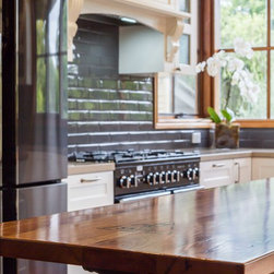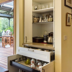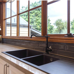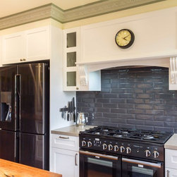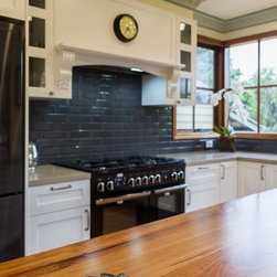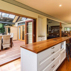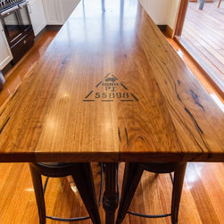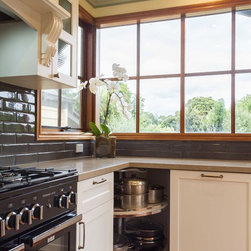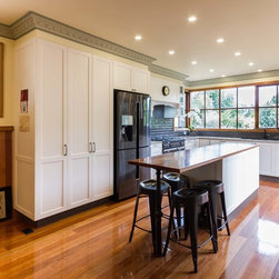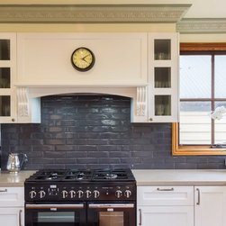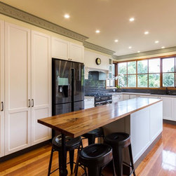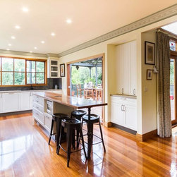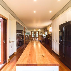 In this home an extension has been added to create a new space for the kitchen, the old space now enlarging the dining area. The timber on the island bench top has been personalized by a friend who surprised the clients with a stamp and an image of a cog wheel, both related to a past connection to the wool grading industry. The clients love antiques. The leg to the island is an old balustrade from Dame Nellie Melba’s estate, which the client meticulously restored. It adds another personal touch to their kitchen which exudes old world charm and character.