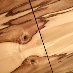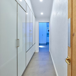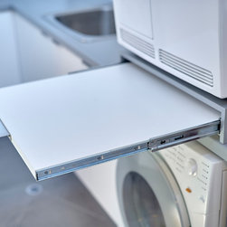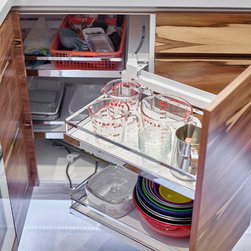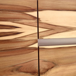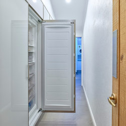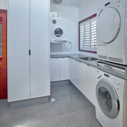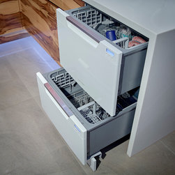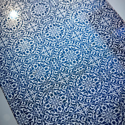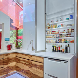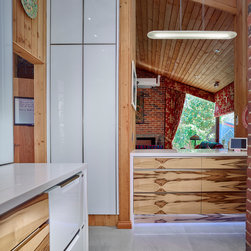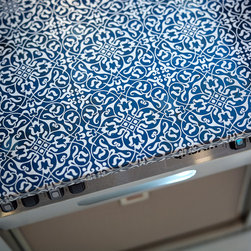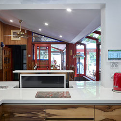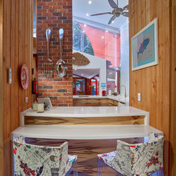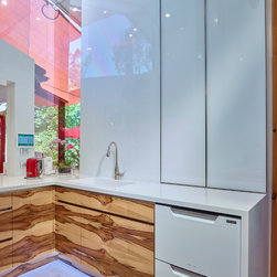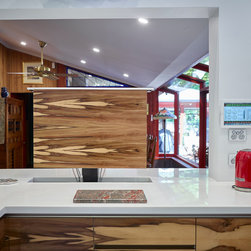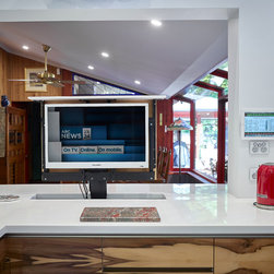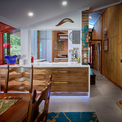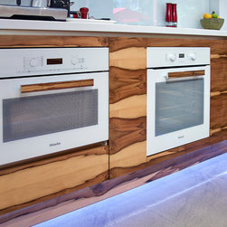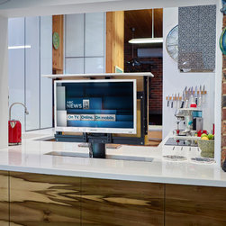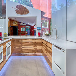The contrast of beautifully stained veneer and glossy glass cabinetry is an incredible design element in this unique kitchen.There are many unique and interesting design features that come together to make this modern, artistic kitchen one of a kind. The shape and architectural design of the kitchen is very different, and we incorporated unique styles to create a distinctive space. The star of the kitchen is the stunning rangehood that is more than 2m long and soars all the way to the ceiling in a striking Sapphire Persian Blu. We designed the cabinetry in two contrasting styles: a modern Starphire white glass and a beautiful, rustic Blackheart-stained veneer. This contrast makes the timber pop against the glass and complements the blue patterned design of the rangehood. The latest technology was implemented to modernise the space, including integrated appliances and a television that lifts up through the benchtop. This warm and spacious kitchen is a mix of different styles and designs, creating a unique heart of the home.