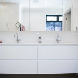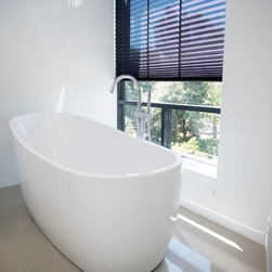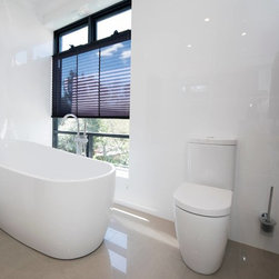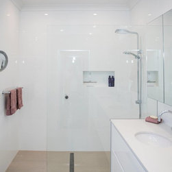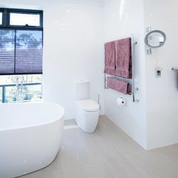 This lovely, fresh bathroom has all the mod cons and more! The deep soaker freestanding bath, perfectly placed next to a large window, will make for many years of relaxing baths. The generous vanity will make those busy morning routines a breeze. Note the addition of a magnifying mirror, wall niche for shower item storage, and underfloor heating. The two-in-one shower is not only beautiful, it also offers the flexibility to choose your showering preference, whether close and focused, or higher and more widespread. The simple two-tone colour scheme, leaves plenty of room for a third accent colour which can be changed at any time, as fashions change or at the whim of the client.