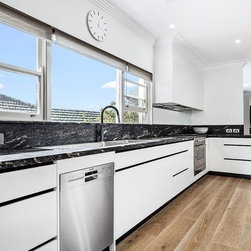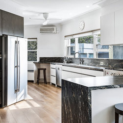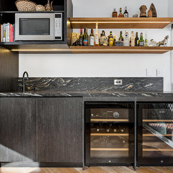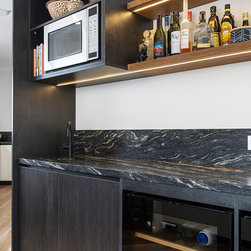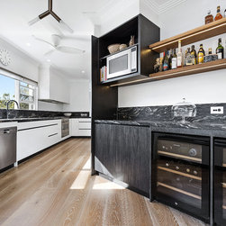 Modern Kitchen | Bar & Wine Fridge | Black Marble Kitchen Benchtops
