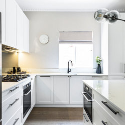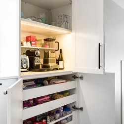 Our design team listened to our clients and created a modern classic L-shaped kitchen with an island and a pantry-appliance cabinet to keep the benchtop clean and clear. We redesigned the laundry adding floor to ceiling storage plus tilt-out baskets to keep the room nice and tidy.