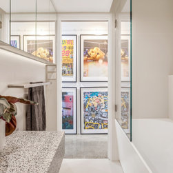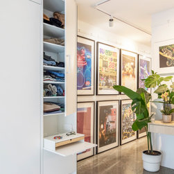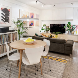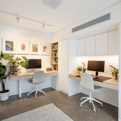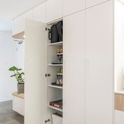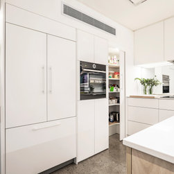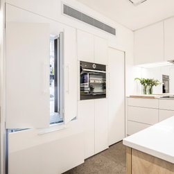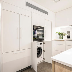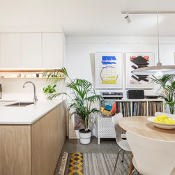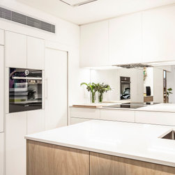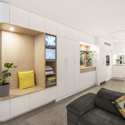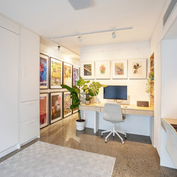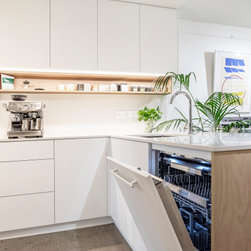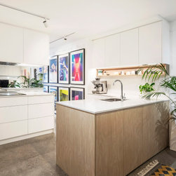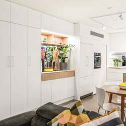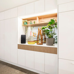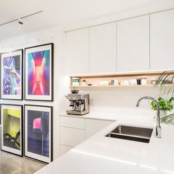 Utilising inobtrusive white cabinets matching the walls, curves and light timber features, created the perfect backdrop to enhance the clients’ substantial collection of modern pop art. Contemporary design elements such as polished cement floors and terrazzo tiles not only meet the brief, they also make for easy maintenance too.