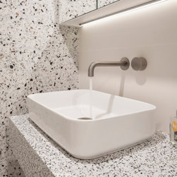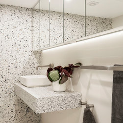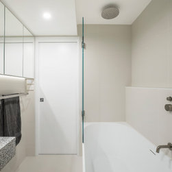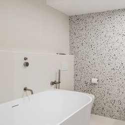 Similarly, the bathroom now looks like one straight out of a design magazine. Completely reconfigured, it no longer needs to incorporate a laundry. Now the space is able to accommodate a shower in an attractive semi-freestanding curved bath with a frameless glass shower blade, a discrete in-wall cistern WC, as wells as a custom basin area with wall-to-wall mirror door shaving cabinets. Fun, achromatic terrazzo style tiles for the feature wall and vanity are right on trend and create a cohesive upbeat look with the rest of the apartment. For the main walls a muted single colour tile enhances the terrazzo’s effect and helps to make the room look larger. The overall effect is calmly funky with a spa feel.