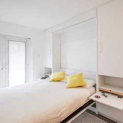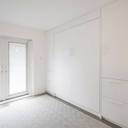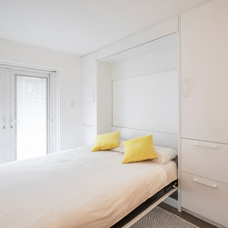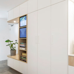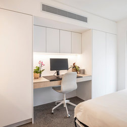 Not having been done with creative design in the first section of the apartment, our designer set to creating a bedroom that truly displays brilliance in design. The space now contains not one, but two independent study desks, as well as two additional built-in wardrobes, and a pull-down Queen bed with built-in bed-side tables and storage. In place of the old tired external door and vertical blinds, is a new, stylish, external glass door with built-in blinds. This space has now become a comfortable and appealing room that is cleverly multi-functional, whether sleeping, working, relaxing, or working out.