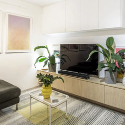 Now, the first thing you see when entering the space, is a beautiful, curved timber TV unit surrounded by artwork, instead of dull, plain walls with random furniture and décor.