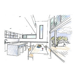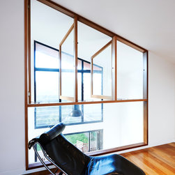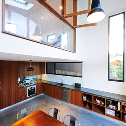 Split house took advantage of a thin inner urban sites natural fall to split the main living spaces. Three refurbished bedrooms and a bathroom accessed off the main original corridor meet the new work at the rear. The split stair leads to the new living room and down reaches the generous kitchen, dining and backyard. A lofty void connects the two spaces facing a 2 storey glazed wall. A palette of polished concrete and steel cladding contrasts the original rooms and restored early 20th century frontage.