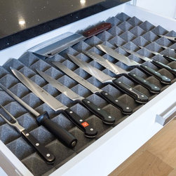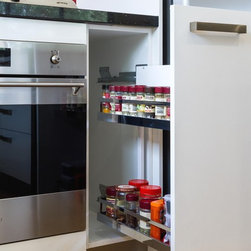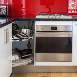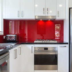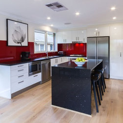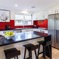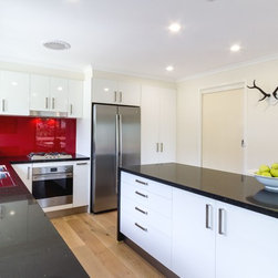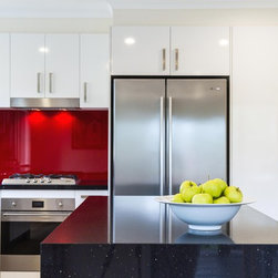 The owners of this home are planning to sell it. They’ve chosen to keep the style simple, yet have made a bold statement to attract the discerning buyer. They have chosen a range of contrasting colours for their new kitchen creating a dramatic, modern look. The benchtops are black, creating a dramatic contrast to the glossy white cupboard doors which help open up the space, keeping it light and airy. Together they form a backdrop for the “wow factor” in the kitchen, the red glass splashback.