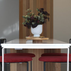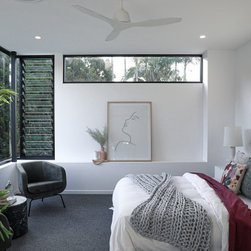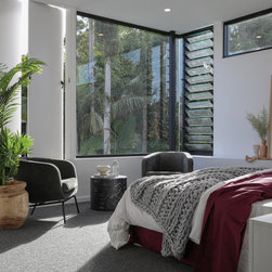 This master bedroom feels like walking into a resort with a clean, modern colour scheme contrasted with leafy greenery and burgundy accents. With large windows and modern lourves this room is a real treat!