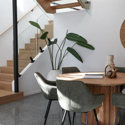 A cosy and tucked away dining room which feels intimate even in an open plan dining/living/kitchen area. Earthy tones create a wam and homely feeling, while remaining on trend.