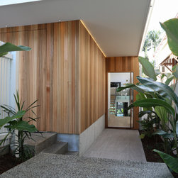 Modern and trendy wooden slats which guide the way to the front door are mirrors by beautiful large plants.