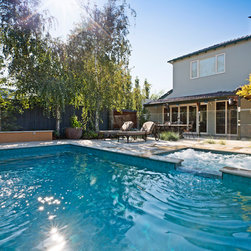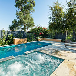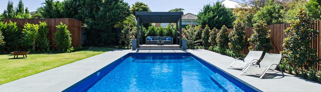 Located at the rear of the property in Moonee Ponds, the 6 metre long rectangle pool creates a tranquil space to be admired and enjoyed. The adjoining spa features large format turquoise tiles which complement the Aqualux Maldive pool interior, creating contrast with the sandstone pool surrounds.
