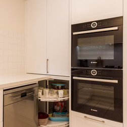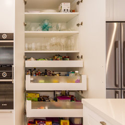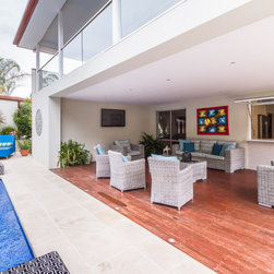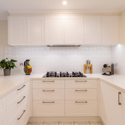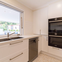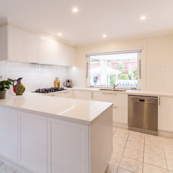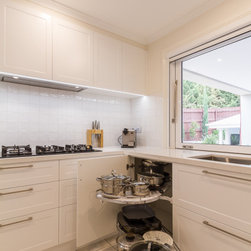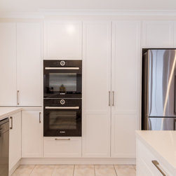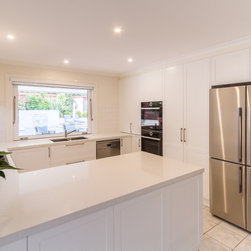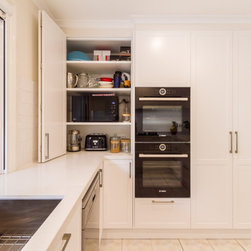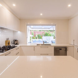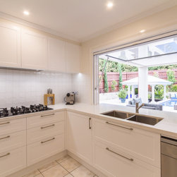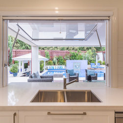 Hamptons inspired kitchen with servery window to outdoor pool deck.