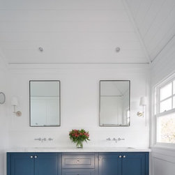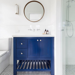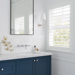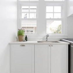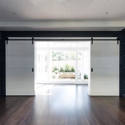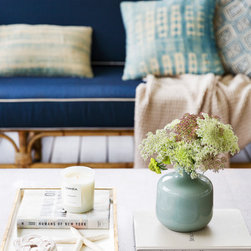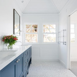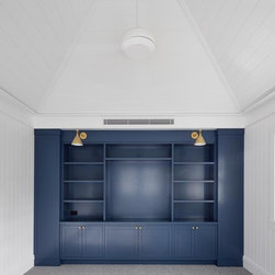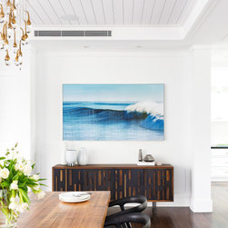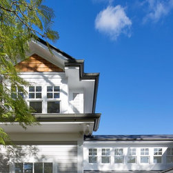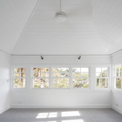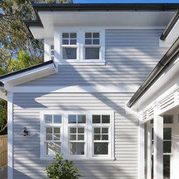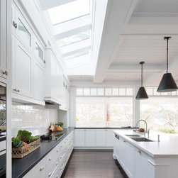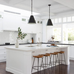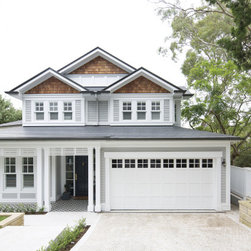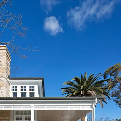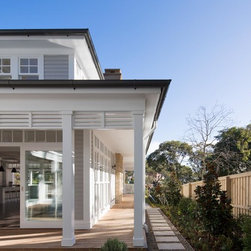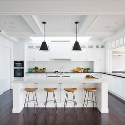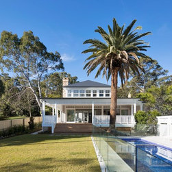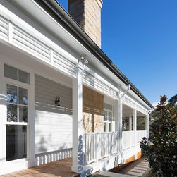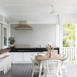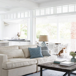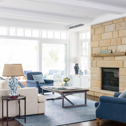 Designed and built by Alex Stritt, this home captures the essence of elegant seaside living with a nod to East Coast American style. A custom sandstone fireplace anchors the living room. Open plan indoor-outdoor areas create a sense of relaxed luxury. Interiors by Janette Stritt.
