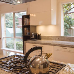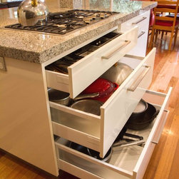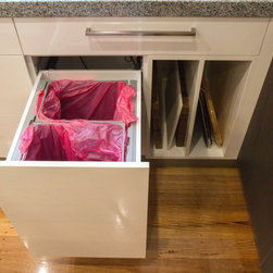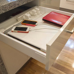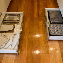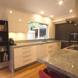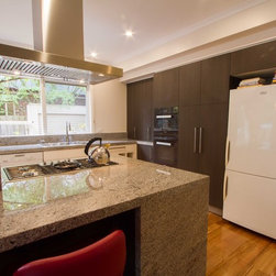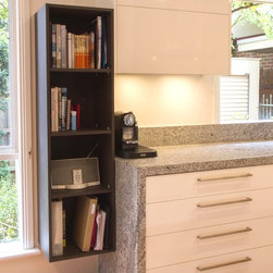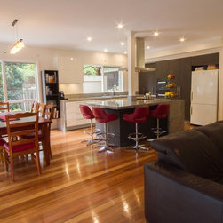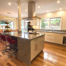 Our client wanted to remove a wall and open the kitchen space up to the living and dining rooms. This was going to be achievable however, this wall was somewhat structural. Leaving a post in the middle was the easiest and most cost effective way of allowing this to happen for the client. A clever tech drawer was also a priority and the large island bench allows for the kids to do their homework while mum cooks. So many clever and practical solutions in this kitchen!