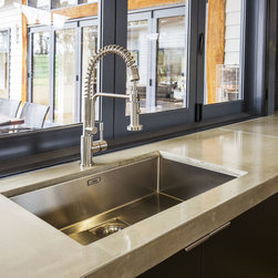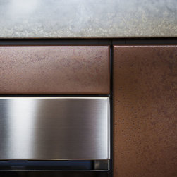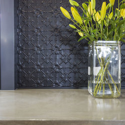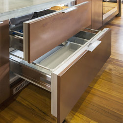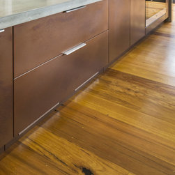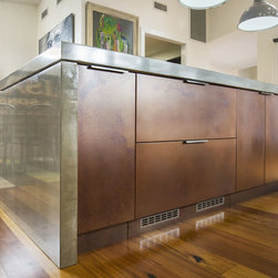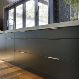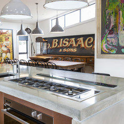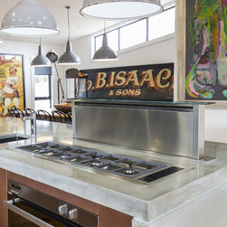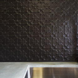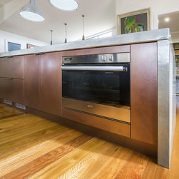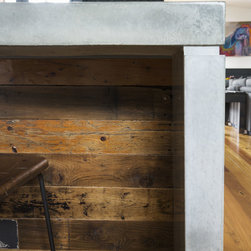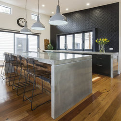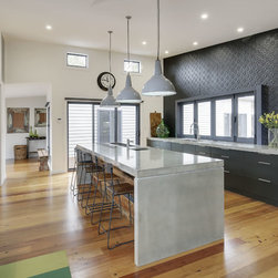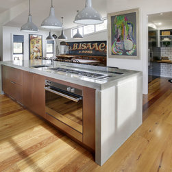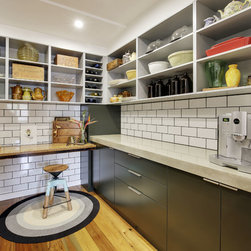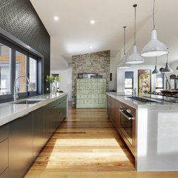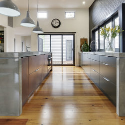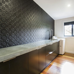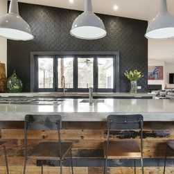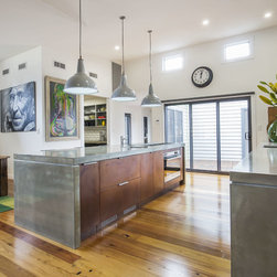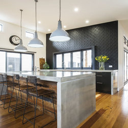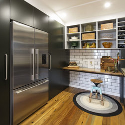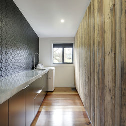 Industrial meets eclectic in this kitchen, pantry and laundry renovation by Dan Kitchens Australia. Many of the industrial features were made and installed by Craig's Workshop, including the reclaimed timber barbacking/doors, the full-height pressed metal splashback and the rustic bar stools.