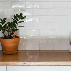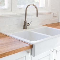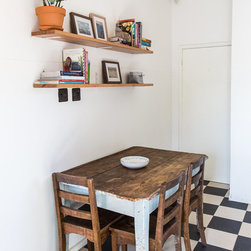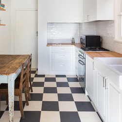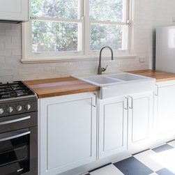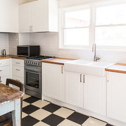 The client chose a mix of natural timber bench tops, rugged Spanish backsplash tiles and farmhouse sink with "Preston" style doors for the cabinetry in Classic White. Timber shelving was added above the dining table to display selected books and trinkets. Along with the checkerboard floor tiles which mimic the old lino flooring, the palette has a rustic style well suited to this intimate space.