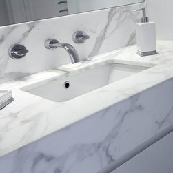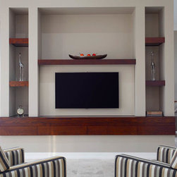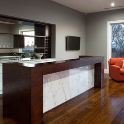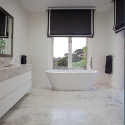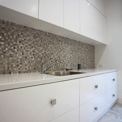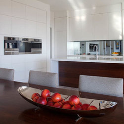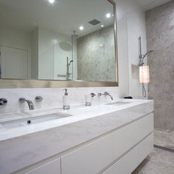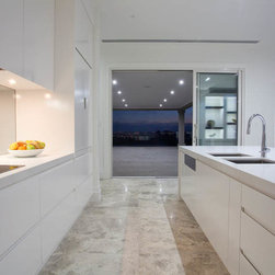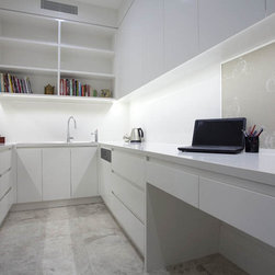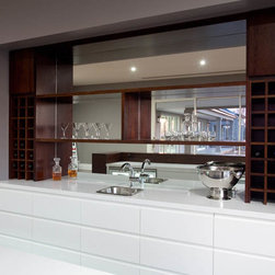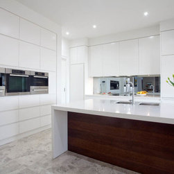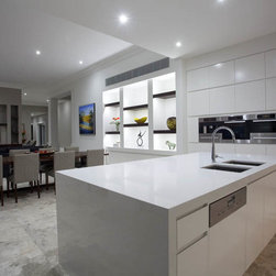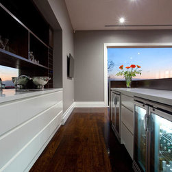 With 360 degree views, this new home needed a Kitchen, Bathrooms, Laundry, Home Study, Bar and other Custom-Made Cabinetry that would do its stunning backdrop justice. Direct Kitchens solution was an Ultra Modern space that oozes style, with functionality at the forefront of its design. The Kitchen Cabinetry features two pack gloss finish paint with finger pulls accented by the warm Timber Stained American Oak Panel. Complimenting the Cabinetry is the crisp white Caesar Stone Bench Tops with waterfall ends.