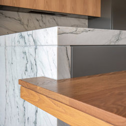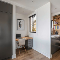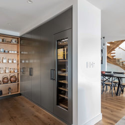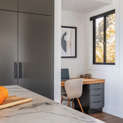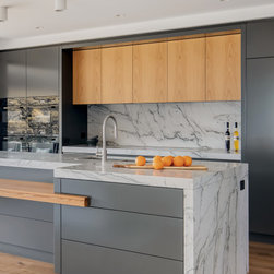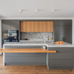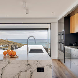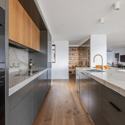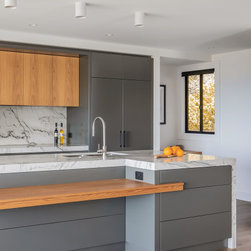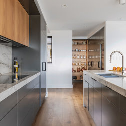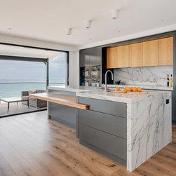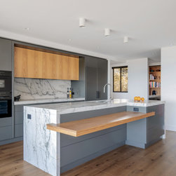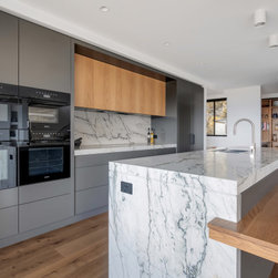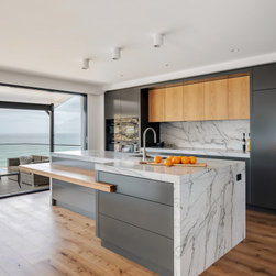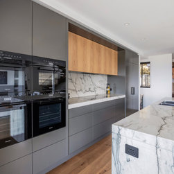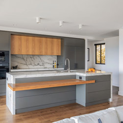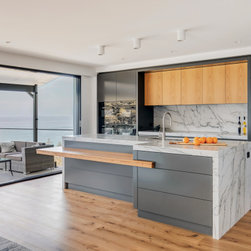 With sublime views of the ocean and Newport Beach, this bespoke kitchen from the team at Dan Kitchens simply takes your breath away. The layout combines a single wall design with island, casual dining, study nook and spacious walk in pantry. Minimalist in design, appliances are concealed/integrated, handles are discreet, and the form is kept geometric and symmetrical. Apart from the gorgeous view, what stands out is the bold material and colour palette. White Macaubas stonework, American Oak doors and shelves, and dark grey polyurethane paint combine to harmonise with the newly renovated home.