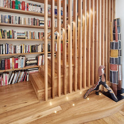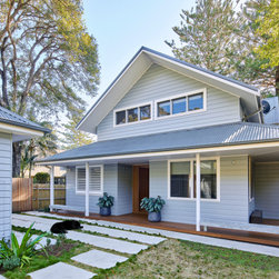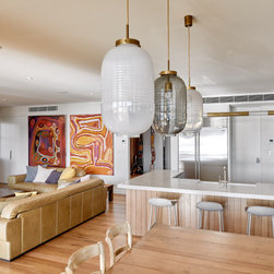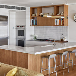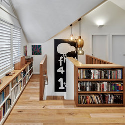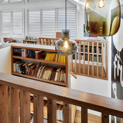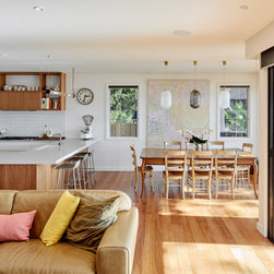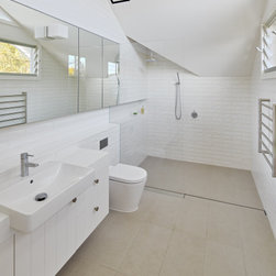 Existing Blackbutt floors were kept and the new stair and joinery feature re-cycled Blackbutt batten screens, benchtops and cladding. Walls were all painted in Dulux Natural White to compliment the extensive art collection which is hung on a recessed art-track system. All bathrooms use the same tile selection of vitrified concrete colored floors and matt white subway on the walls, to reflect light from high-level louvres and skylights. The end result is a home that is relaxed, offers generous open plan living and is connected to the stunning location. The state-of-the-art kitchen, pantry and ancillary spaces make the rituals of daily life easier while the outdoor spaces and garden allow time for contemplation and reflection.