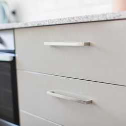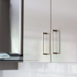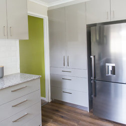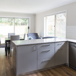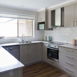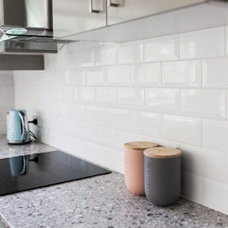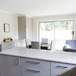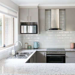 A few special details such as bevelled white subway tiles with an eye catching stone bench top (Atlantic Salt by Caesarstone) has given this kitchen a gorgeous modern look.