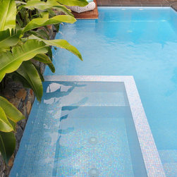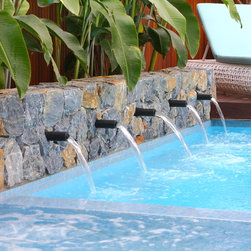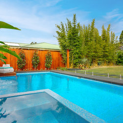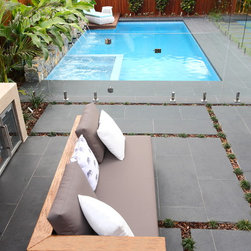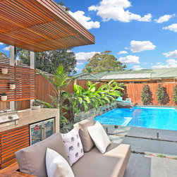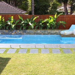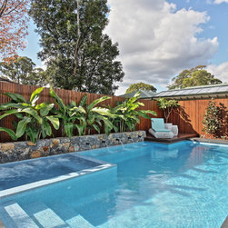 Modern tropical garden design comprising of covered outdoor kitchen and BBQ area, leading into a beautiful pool with integrated spa. The pool lies elegantly alongside a stunning natural stone feature wall with tropical heliconias reaching out. Privacy is created with the hardwood timber batten screens. A great combination of materials used including hardwood timber, natural stone tiles and steppers.